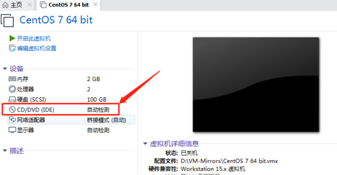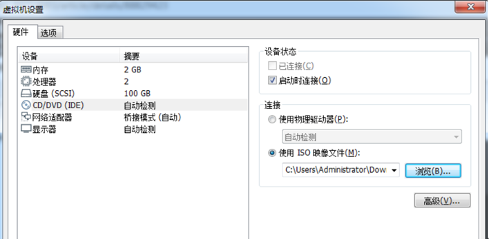 2、 在连接处选择 使用ISO映像文件选择CentOS 7 iso文件,确定。