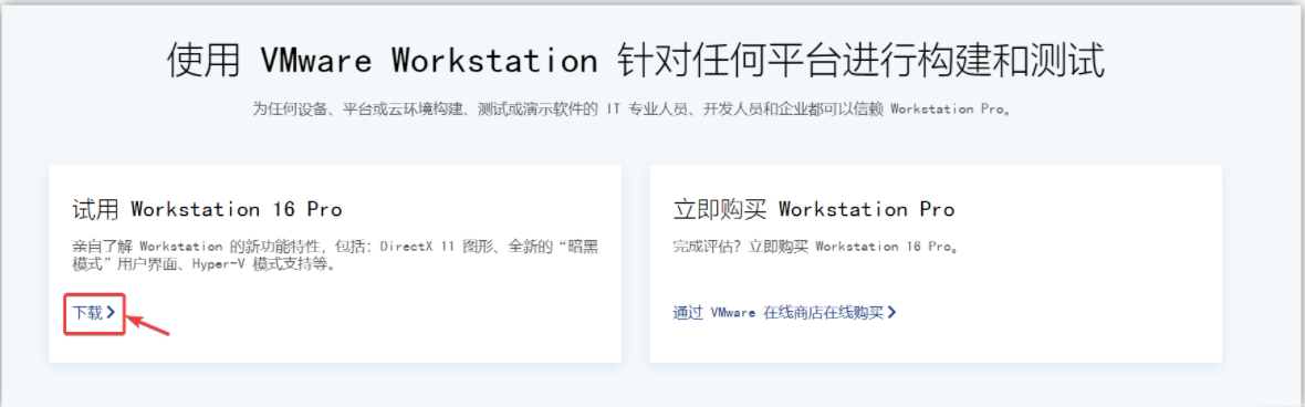试用 Workstation 16 Pro 下方的下载链接,跳转至下载页面。