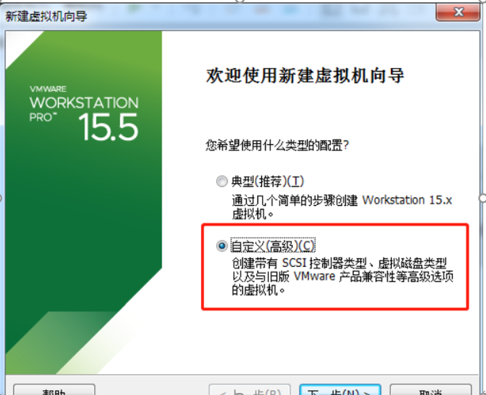 1、打开VM虚拟机,文件 → 新建虚拟机 → 自定义 → 下一步。