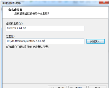 5、命名虚拟机(能一眼就知道该虚拟机的类型、版本。例如:CentOS 7 64 bit),位置(D:\VM-Mmirrors\CentOS-7-64-bit),这样可以在VM-Mmirrors,文件夹放多个操作系统,