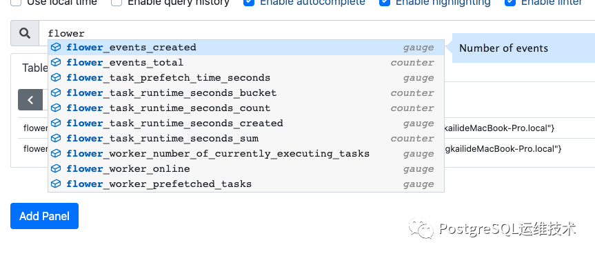 访问http://localhost:9090/graph,graph标签,并在搜索框键入flower,应该会在下方自动显示flower中所有可用的指标。