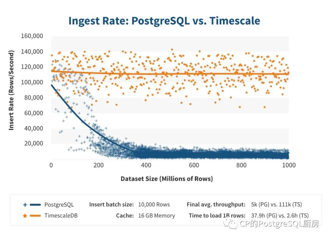 对于时间序列数据,TimescaleDB 比 PostgreSQL 实现了更高和更稳定的摄取率。正如我们在架构讨论中所描述的,一旦索引表不再适合内存,PostgreSQL 的性能就会开始受到严重影响。