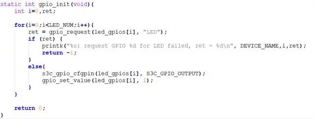 关于led管脚的申请、赋值以及配置所使用到的主要函数为:GPIO申请函数和赋值函数gpio_request – gpio_set_value()、三星平台的GPIO配置函数s3c_gpio_cfgpin()、GPIO配置输出模式的宏变量S3C_GPIO_OUTPUT。