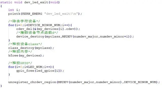 在模块出口函数中,主要完成一些释放工作,例如注销设备、注销设备节点、释放gpio等。