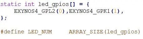 (1)确认led所连接的引脚,led1、led2分别连接的引脚为EXYNOS4_GPD0(0)和EXYNOS4_GPD0(1),此处的EXYNOS4_GPD0(0)是一个宏,该宏是IO引脚的结构描述,两个led定义为一个数组的代码如下: