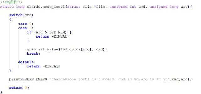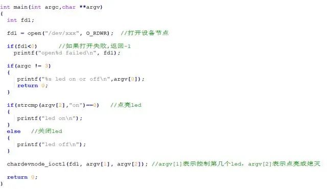 (4)写led设备与文件操作相关的函数(在本例中主要是open()函数和ioctl()函数等),代码如下: