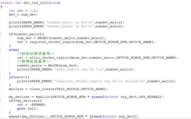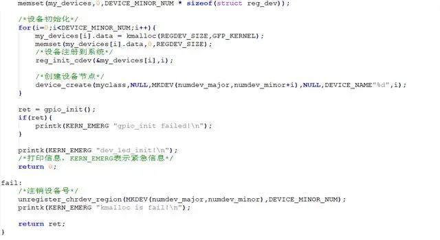 在模块入口函数中,主要完成注册设备、设备初始化、将设备注册到系统、创建设备节点以及申请gpio并初始化。