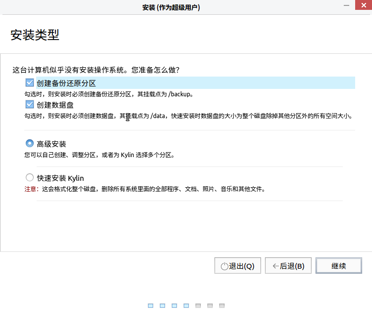 系统安装勾选“创建备份还原分区”和“创建数据盘”选择“快速安装”,点击“快速安装”。输入正确的相关信息后,点击“继续”。等待约 10 分钟左右后,完成安装。