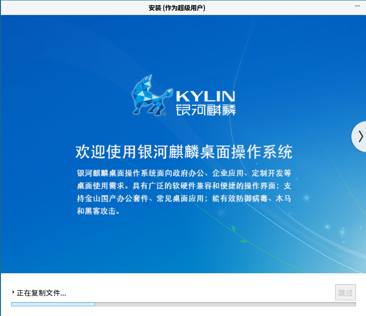 装银河麒麟系统一直停在“正在复制文件”,需要的时间比较长。