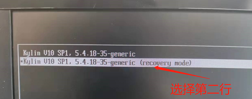 2、选择“Kylin v10,with linux 4.4.131-20200710.kylin-desktop-gener ic(recovery mode)”