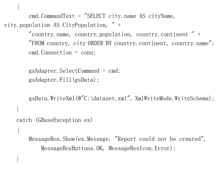下面的代码演示将一个查询的结果生成一个 DataSet 并把它写入 XML 文件