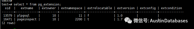 首先确认您是否拥有了 pageinspect 这个 extension ,下图通过查看pg_extension这个表您可以确认,当前您的PG上已经安装了这个extension.