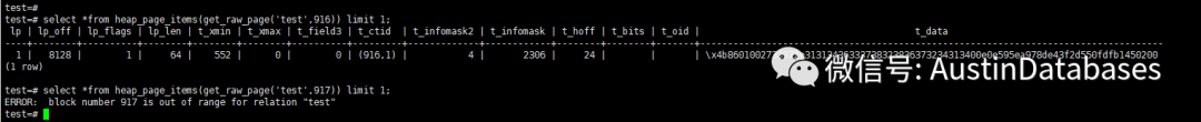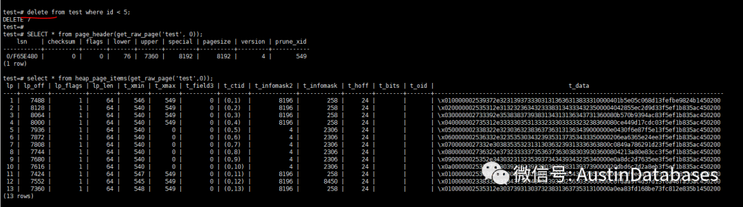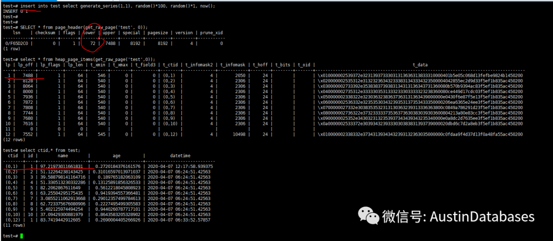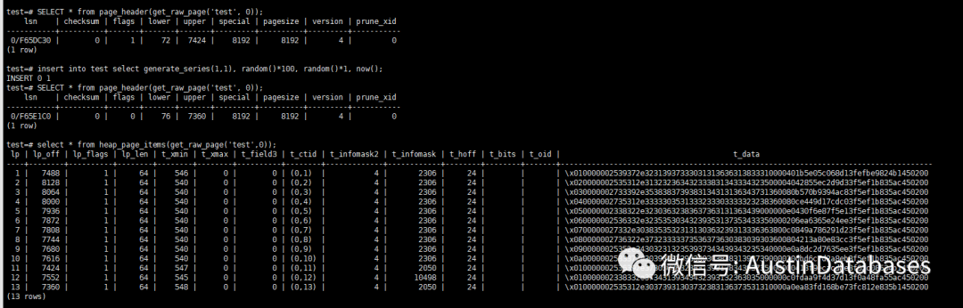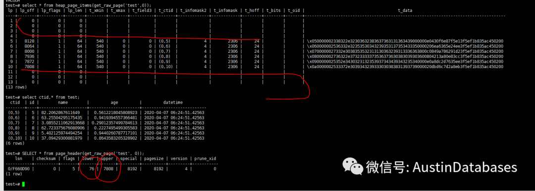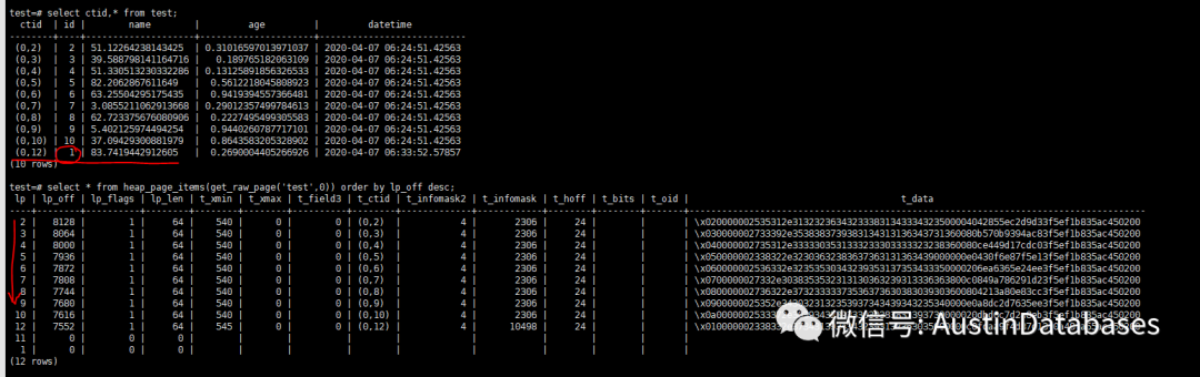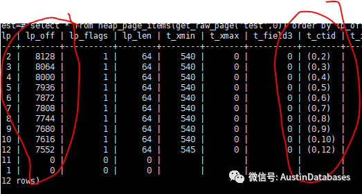 select * from heap_page_items(get_raw_page('test',0)) order by lp_off desc;