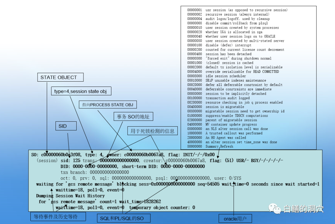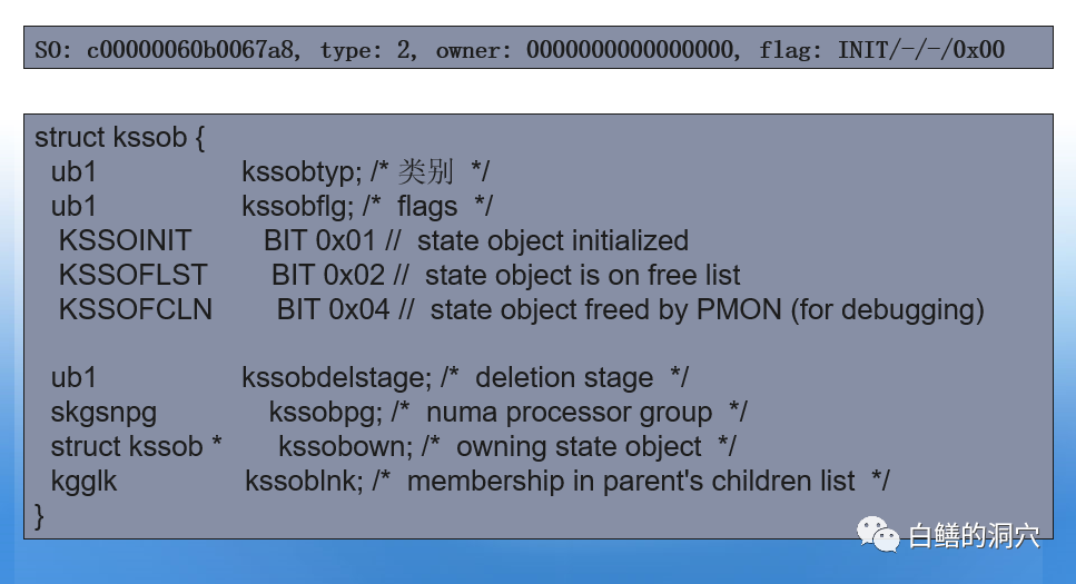 故障或者失效的STATE OBJECT会被PMON 用于故障清理,我们经常可以在SYSTEMSTATE DUMP和PROCESSSTATE DUMP中看到各种STATE OBJECT。比如对于一个进程,就存在一个PROCESS STATE OBJECT,该OBJECT还包含了会话,CURSOR等。