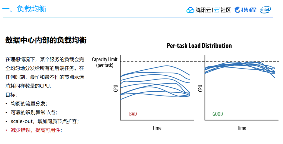 数据中心内部的负载均衡方面,理想情况下会像上图右边显示那样,最忙和最不忙的节点所消耗的 CPU 相差幅度较小。