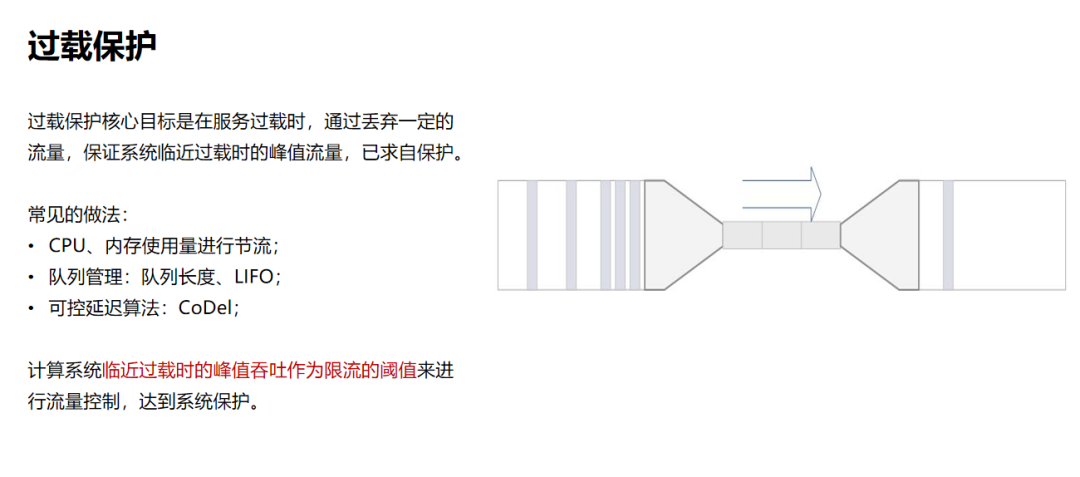 在过载保护方面,核心思路就是在服务过载时,丢弃一定的流量,保证系统临近过载时的峰值流量,以求自保护。