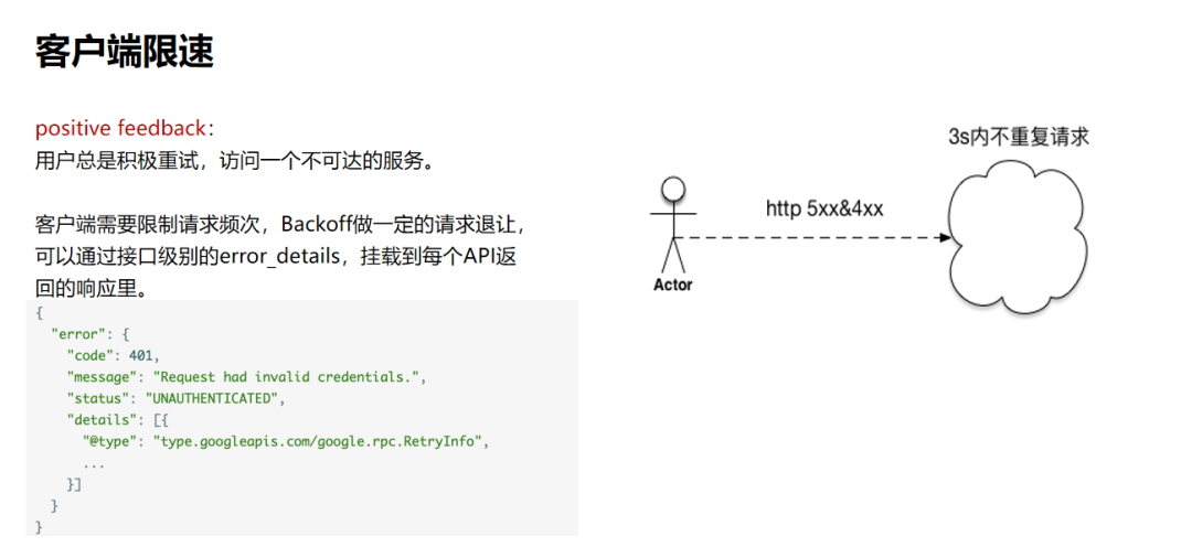而在客户端侧,则需要做限速。因为用户总是会频繁尝试去访问一个不可达的服务,因此客户端需要限制请求频次,可以通过接口级别的 error_details,挂载到每个 API 返回的响应里。