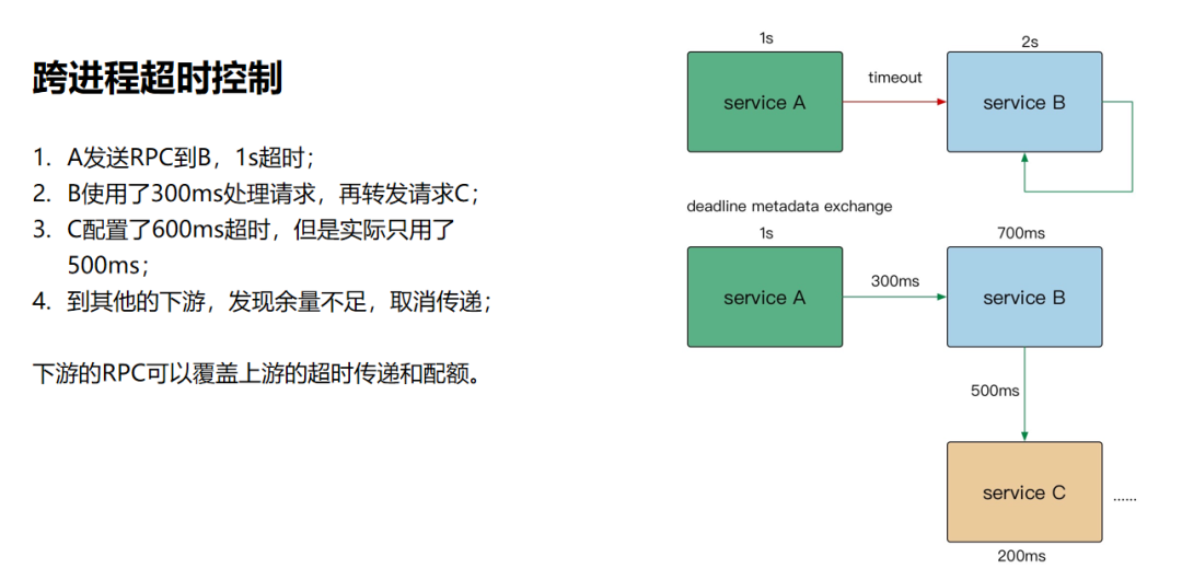现在很多 RPC 框架都在做跨进程超时控制,为什么要做这个?跨进程超时控制同样可以参考进程内的超时控制思路,通过 RPC 的源数据传递,把它带到下游服务,然后利用配额继续传递,最终使得上下游链路不超过一秒。