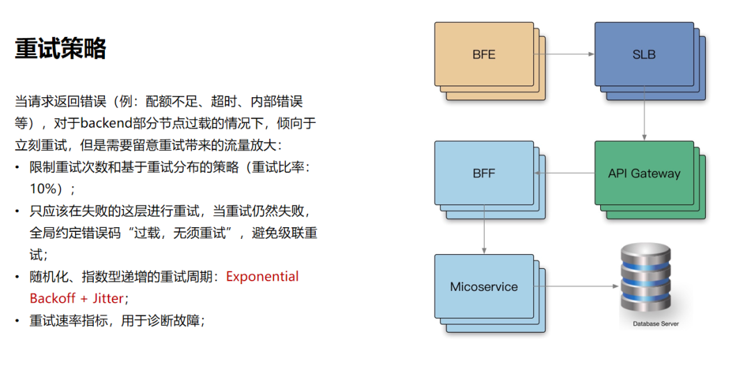 第三,在重试策略上,在微服务内尽可能做退避,尽可能要考虑到重试放大的流量倍数对下游的冲击。