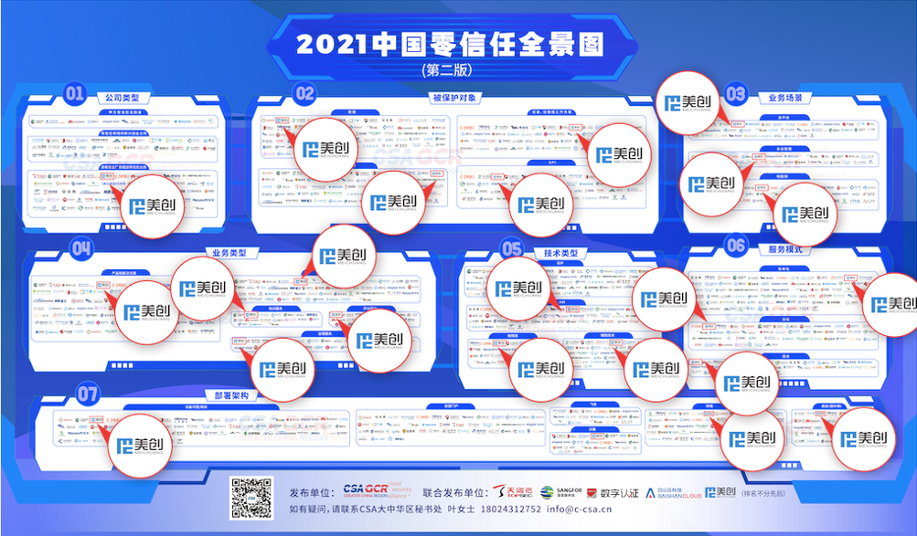多年研发实践打磨,零信任作为是美创科技数据安全产品体系的核心,也得到行业与市场的认可,在云安全联盟大中华区(简称CSA)正式发布的《2021中国零信任全景图》,美创科技成功入选全部七大分类。