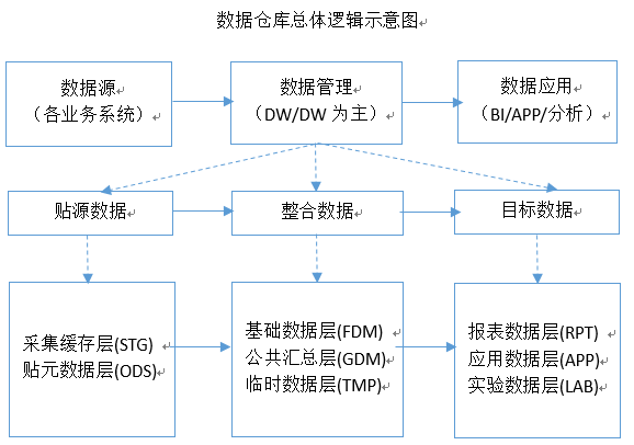 以上仅是数仓建设过程中一些通用之法,实际建设中应具体情况具体分析。数仓他是一个复杂且周期很长的项目,他的建设不仅仅是由一个团队去完成的,他需要多个团队甚至多个部门去做支撑与支持。另附数仓总体逻辑示意简图,仅供参考: