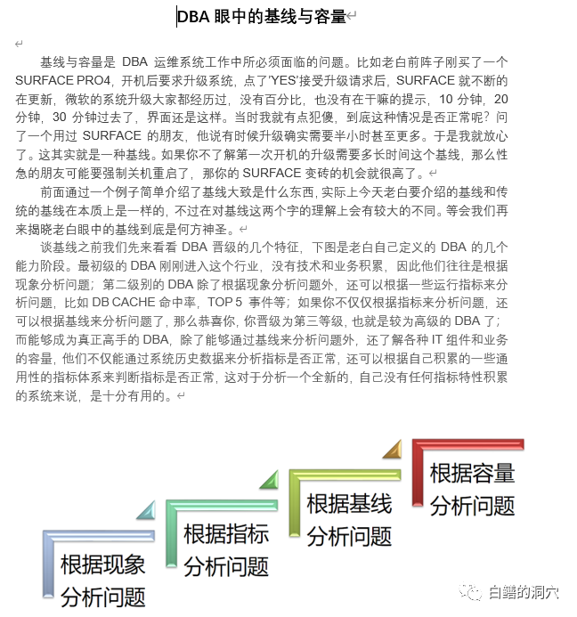 是不是很悲催,DBA这口饭真的不好吃。实际上,DBA需要掌握的不仅仅如此。在2015年的一个沙龙上,老白讲了一个DBA应该掌握关键基线与容量指标的故事。