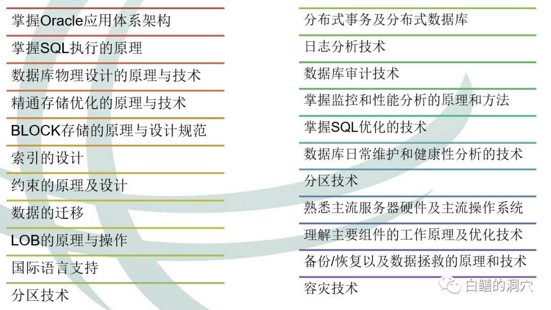 上面这张图是老白在十多年前给客户培训的时候,对开发DBA提出的技能要求,做开发辅助的DBA,重点是如何帮助研发人员写出好的代码,以及设计好的数据库物理模型。其中掌握存储优化的原理与技术是为数不多的和数据库专业无关的技术要求。那时候的存储系统的性能较差,数据库往往会在存储性能上出现问题,如何做好条带化设计,以及采用合适的RAID技术对于数据库长期稳定运行至关重要。老白在2000年后,也多次帮助用户通过优化存储架构,优化RAID组的设计,解决了一些十分棘手的性能问题。对于运维DBA的技能要求如下图: