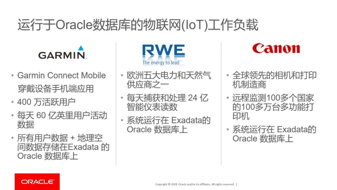 许多工业互联网行业的企业已经采用Oracle数据库技术作为物联网平台数据管理的核心方案处理物联网工作负载。比如著名零售企业每天400万活跃用户与60亿英里空间数据的处理均在Oracle数据库构建的数据管理方案上,能源行业巨头每天捕获和处理24亿智能仪表读数的系统运行在Exadata上,以及全球领先的制造企业远程检测全世界100多万台终端的物联网工作负载也运行在Exadata的Oracle数据库构建的物联网平台上。