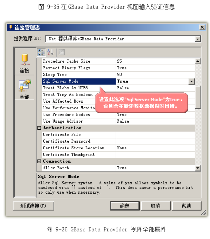 立 GBase 数据源后,一定要选中“Sql Server Mode”连接串选项。否