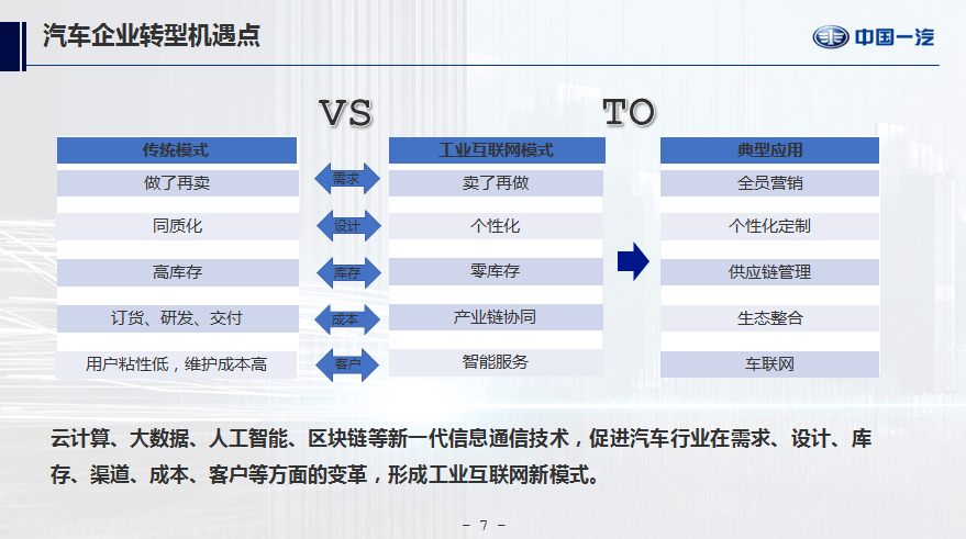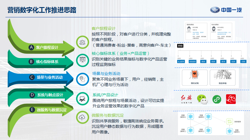 在汽车行业的整个价值链中,营销最为接近消费者,也最容易为企业带来实际收益。随着数字化转型在汽车企业的不断深入,“中台”已然成为助力转型的关键项目,那么如何让中台在业务端呈现价值,目前最有可能落地实现的就是在营销环节的应用。2月25日,在CIO发展中心举办的“汽车行业中台实践”线上专题研讨会上,一汽集团数据运营管理部总监陈光与参会嘉宾分享了《汽车行业营销数字化转型的关键要素》。陈光主要结合一汽在中台的落地以及汽车行业营销的特点分析了营销在数字化转型当中关注的基本要素:企业如何构建数字化能力、营销数字化工作的推进思路、围绕用户旅程的数字化产品全景图、大规模敏捷管理框架,以及项目组组织形式和整体分区思路,最终实现业务数据一体化、双轮联动,引领业务数字化变革等等。随着云计算、大数据、人工智能、区块链等新一代信息通信技术的发展,第四次工业革命正在悄无声息的颠覆着近乎所有的产品与服务。技术的发展使得万物互联的时代越来越近了!信息的交换变的简单,万物互联能让我们轻松的获取足够多的信息。再加之AI技术的不断成熟,获取数据的效率和质量也不断提升,对数据的深入思考和分析,使得我们的业务有很多创新的可能性。业务的发展永远跟不上技术的发展,技术的发展总会促进业务的创新,甚至可能会颠覆企业现有业务。数字化转型使IT技术人员由之前业务主导的系统搭建,转变为IT推动企业业务创新,让企业由业务主导转变为技术驱动,帮助决策者看清未来。整个企业的发展变成了 “业务战略”和“信息技术战略”循环的双轮驱动模式,通过技术的推动,提升公司治理、风险管理和经营管理水平、加强产业链整合、拓展上下游市场等等,反过来业务战略也会对信息化提出更多的要求。第四次工业革命给企业未来的生产力和生产关系带来了变化,企业需要根据实际情况重新调整生产关系。大量的数据变成了生产资料,经过清洗加工变成有价值的信息,数据使人工智能技术越来越成熟,智能变成了一种生产资料或者核心能源。那么,智能机器人或智能终端作为生产力,未来会大面积运用在企业运营的各个环节,人工也是其中一部分,生产关系的重构使得“人单合一”得到实现。未来,每一个人、每一个点都可能成为个体经济的载体,未来的终极状态便是智力通过平台就能够发生生产交互。随着工业互联网、产业互联网的发展,消费互联网向产业互联网的转移,中台作为业务模型和数据的沉淀,将成为下一代基础设施。第四次工业革命颠覆着所有产品和服务,汽车行业在这个过程当中有哪些机会?通过中台能够获取到大量的多元化的数据,又能给车企带来哪些机会?传统模式下产品生产出来以后才去出售,导致市场上产品的同质性、库存大、整条产业链成本居高、用户粘性低、维护成本高等等弊端。在工业互联网模式下的定制化生产,严格根据客户的需求来进行个性化生产,使车企实现零库存;因为数据的透明,可以与供应商、用户、研发人员等整个产业链进行协同,这些都是未来汽车行业新的机遇。技术革命成为企业发展的主动力,数字化技术人员未来的工作内容和业务范围也会发生很大的变化。但数字化转型的核心还是对于企业全要素生产率的提升,宗旨和目标是一定的,只是方式和方法发生了变化,切入点和场景发生了变化。中国企业高质量发展的本质是企业全要素生产率的提升,所以,企业做数字化一定要围绕企业发展本质去发力,这也是汽车行业未来发展存亡的关键。在当前经济环境下,车企竞相抢占市场空间,但关键还是成本和获取客户的竞争。从宏观上,一汽定义了数字化能力图谱。企业的数字化战略转型需要全面提升企业的数字化能力,从数字化管理体系的角度出发,制定公司的数字化能力图谱,从数字化意识、业务能力(数字化运营能力、数字化产品设计能力)、平台能力、数据能力、部署能力、安全防护能力六个层次定义了企业的数字化能力全集。最上层,全员要有数字化的意识。企业需要帮助员工获得新的数字化技能,员工也需要需要具备更多跨领域的知识和技能储备。向下,所有业务部门要具备数字化运营能力,包括:商业模式设计、盈利模型设计、用户触点分析,业务数据模型设计和研究。同时这些业务部门还需要具备数字化产品设计能力,包括如何设计围绕用户体验的高频互动、故事化、聚合化的用户APP产品设计。这些新的业务要求业务部门逐渐具备这些能力,数字化部门和信息化部门不可能把所有的产品都设计出来。接下来是平台能力和数据能力。平台能力未来将会成为基础设施,需要具备体验化技术、业务模型化、服务组件化的能力、API管理、生态接入聚合的能力等等。数据能力包括:数据管理体系,数据内容体系、数据技术体系、数据价值体系等。这两部分其实正是大家所称的双中台——业务平台和数据平台。最下层是基础设施,云化资源管理能力,右侧是防护安全能力和数字化管理体系的能力。未来,一整套的数字化能力需要全体系全企业进行沉淀落地,这也是数字化转型的终极结果。数字化产品设计是数字化业务能力的核心,基于最终客户的体验设计数字化产品是实现数字化经济的重要活动,要从客户旅程的生命周期管理出发,充分定义用户触点,深