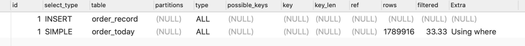 通过观察迁移 SQL 的执行情况你会发现 order_today 是全表扫描,也就意味着在执行 insert into select from 语句时,MySQL 会从上到下扫描 order_today 内的记录并且加锁,这样一来不就和直接锁表是一样了。
