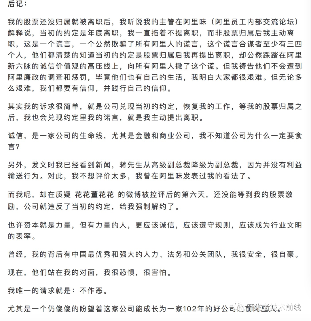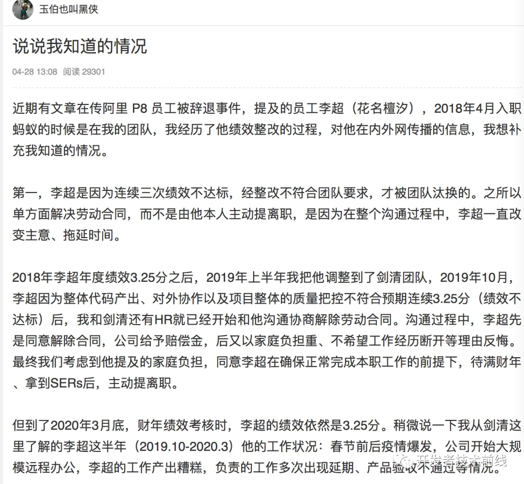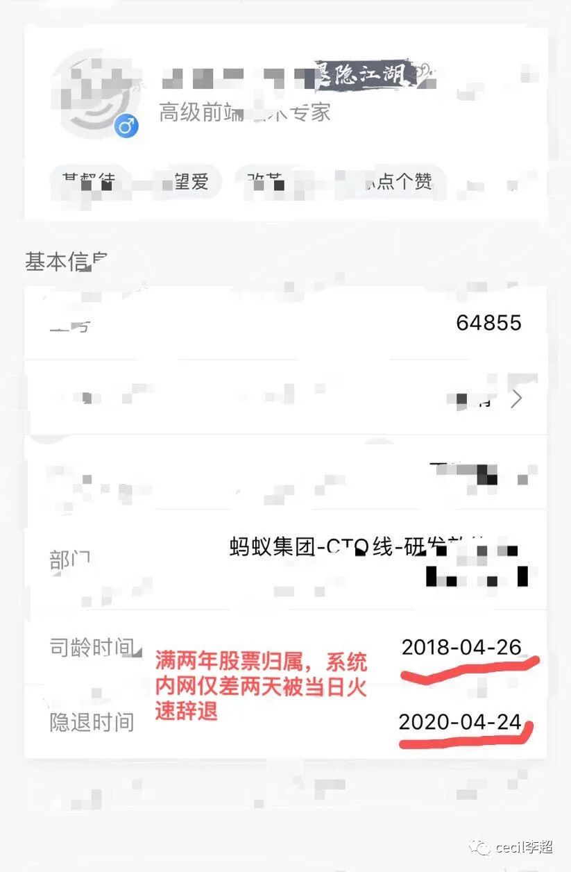 》文章在朋友圈刷屏。文章内容提到:蚂蚁金服的一位写代码的P9,在股票还差三天就归属时,被公司单方解除了劳动合同。系统显示我在距离股权激励归属前两天“隐退”了,“隐退”就是离职状态P8上级 P10 回应