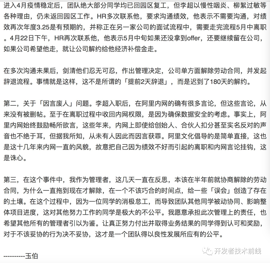 4月27日消息,今日阿里巴巴集团公布了蒋凡事件的调查处理结果。该调查由阿里巴巴集团廉正部成立特别调查组进行。根据调查,由阿里巴巴集团管理层形成了处理结果,阿里合伙人委员会也对此进行专项审议。 调查组就阿里集团对如涵电商的投资,以及张大奕所有淘宝、天猫店铺的入驻、活动、引流、交易等做了全面的内、外部调查。确认:阿里在2016年投资如涵电商的决策与蒋凡无关;蒋凡对如涵电商、张大奕所有淘宝、天猫店铺的经营活动并无任何利益输送行为。 但调查组认为,蒋凡在公司重要的岗位上,因个人家庭问题处理不当,引发严重舆论危机,给公司声誉造成重大影响。经阿里巴巴管理层讨论决定对蒋凡作以下处分:1、 管理层提议并得到合伙人委员会批准,即日起取消阿里合伙人身份。3、 降级。职级从M7(集团高级副总裁)降级到M6(集团副总裁)。P8码农发帖“质疑控评遭辞退”