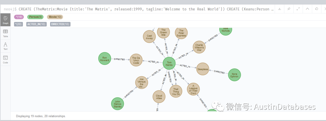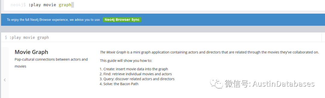 在输入 :play movie graph 后,你可以看到上图从如何创建,一个实例的图,找寻数据,查询数据等等这些操作