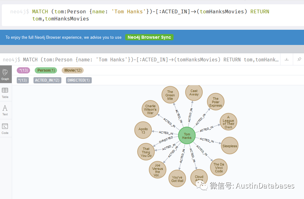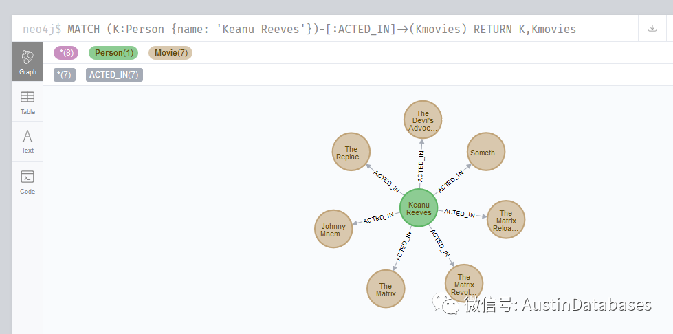 当然写到这里我也是纳闷了两天 tom 和 tomHanksMovies 我根本就没有在任何地方输入过这些信息到NEO4J中,到底他们是怎么展示的这些信息,在经过琢磨后,照猫画虎的写出了下面查询Keanu 到底演过什么电影的查询语句。同样 K,Kmovies 我都没有输入过,到底是怎么回事???