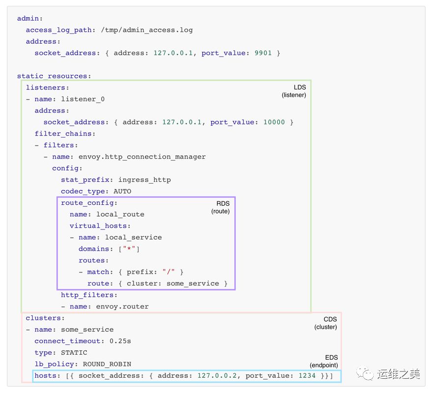 admin:access_log_path: /tmp/admin_access.logaddress:socket_address: { address: 0.0.0.0, port_value: 9900 }static_resources:listeners:- name: listener_ingressaddress:socket_address: { address: 0.0.0.0, port_value: 10000 }filter_chains:- filters:- name: envoy.http_connection_managerconfig:stat_prefix: ingress_httpcodec_type: AUTOroute_config:name: local_routevirtual_hosts:- name: local_servicedomains: ["*"]routes:- match: { prefix: "/envoy-server/hello" }route: { cluster: cluster_server }- match: { prefix: "/envoy-server/hi" }route: { cluster: cluster_server }http_filters:- name: envoy.routerclusters:- name: cluster_serverconnect_timeout: 0.5stype: STATIClb_policy: ROUND_ROBINhosts:- { socket_address: { address: 127.0.0.1, port_value: 8081 }}