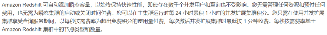 到了这一阶段,则更加贴近用户的实际使用需求提供弹性能力。比较典型的如AWS提供的“并发扩展”能力,如下段描述。