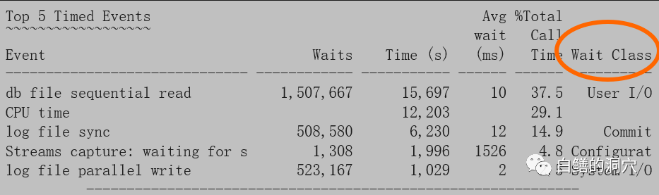 我们可以看出,db file sequential read的平均值是10毫秒,有点高,但是还算正常,是处于正常值的高值,可能IO对数据库有一定的影响,但是不一定致命。而中间的Streams capture:waiting for 这个指标是异常的,这个数据与上面的SGA RESIZE出于同一份AWR报告,也就说明了,当时可能是STREAMS捕获进程存在一些问题,导致了SGA RESIZE,抑或是SGA RESIZE导致了STREAMS捕获进程产生了一些不必要的等待。这样我们就又有了一个相对明确的分析方向了。