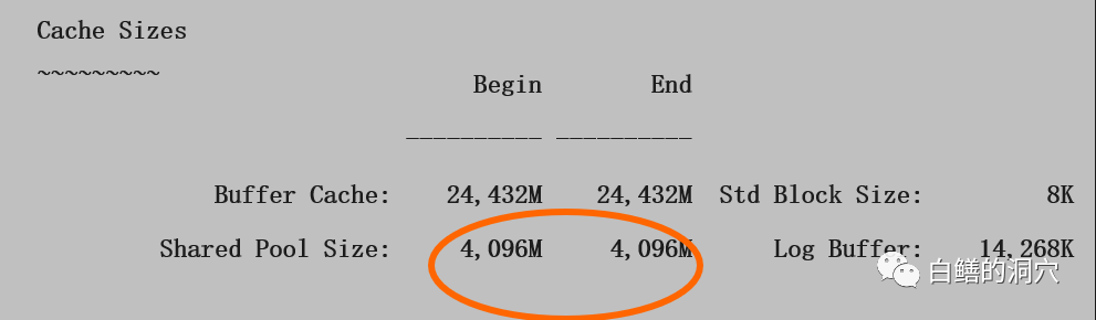 这仅仅是AWR的头,其中就蕴含了十分丰富的信息。不说前面的数据库版本,是否RAC,仅仅从老白画圈的这三个数据,就蕴含了十分丰富的内容。Sessions的数据是报告的两个采样点的会话数量,curs/sess是每个SESSION平均打开的CURSOR的数量。从这两个指标的绝对值以及两个SNAP之间的变化就可以看出会话变化的一些细节。会话数是高是低,变化趋势等信息。而每个会话打开的CURSOR数量则说明会话执行SQL的情况,以及可能对共享池产生的影响,同时可以用于分析OPEN_CURSOR参数与session_cached_cursors参数是否合理。DB Time是另外一个十分重要的指标,DB TIME与ELAPSED的比值可以看出系统的负载或者等待事件的情况。这个值的高低和活跃会话的数量也有十分大的关系。老白贴出的案例中大概是10左右。到底这个值是多少才是合理的?这个恐怕要和你的系统的基线有一定的关系了。如果你是经常维护这套系统,那么你可以每天都关注下业务最高峰时候这个指标的情况,如果这个比值出现了较大的偏差,那么你就需要认真的阅读这份报告,找到为什么会出现这样的异常了。我们再继续看看下面的数据,关于CACHE的数据,大家可能觉得没那么重要。实际上我们看看buffer cache和shared pool size在BEGIN END两个SNAP的差异,也能发现一些问题:
