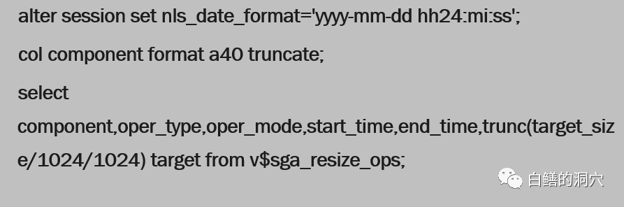 上面的案例是没变化,从中看不出异常来,如果BEGIN/END有差异,而且差异比较大,那么我们就要关注SGA的性能是否存在问题了,是否存在SGA抖动了。11g以后的版本的AWR报告中就有SGA RESIZE的情况,你可以在后面去查看,如果是10g的数据库,那么,可以到相关的视图中国去查看SGA RESIZE的情况。