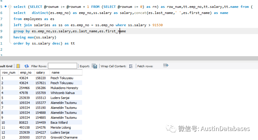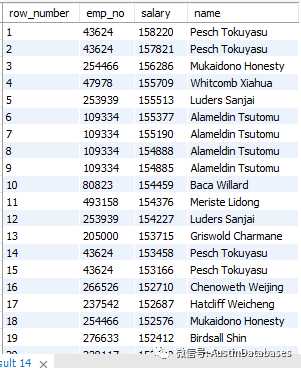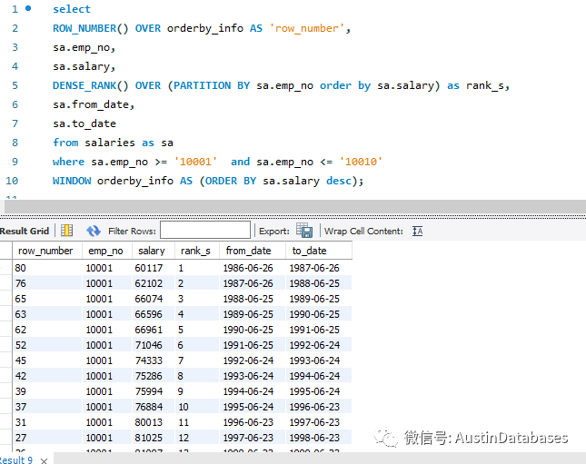 下面这个语句的意思是,根据员工的工资进行一个排序根据每个员工的工号作为一个排序的partition by ,从这里可以看到每个员工的随着在公司工作的年限,越长,工资的涨幅和总数都是一个向上的过程,这样的复杂操作如果在MYSQL 5.7 我是真想不出在一个SQL 中很顺利的完成它。