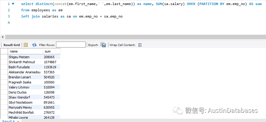 另外还有一些常用的统计功能,例如统计员工这些年的薪金总和可以使用sum 求和,通过对员工号进行partition 来对数据进行查询。