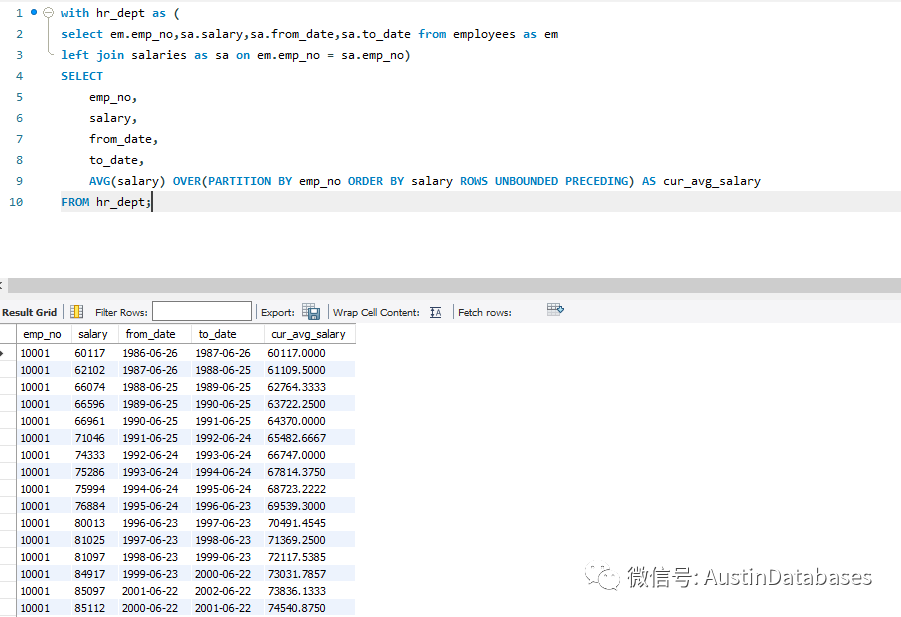 AVG(salary) OVER(PARTITION BY emp_no ORDER BY salary ROWS UNBOUNDED PRECEDING) AS cur_avg_salary
