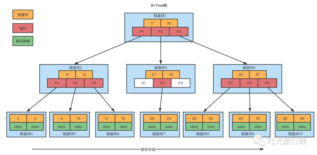 浅蓝色的块我们称之为一个磁盘块,可以看到每个磁盘块包含几个数据项(橙色所示)和指针(红色所示),如磁盘块1包含数据项17和35,包含指针P1、P2、P3,P1表示小于17的磁盘块,P2表示在17和35之间的磁盘块,P3表示大于35的磁盘块。