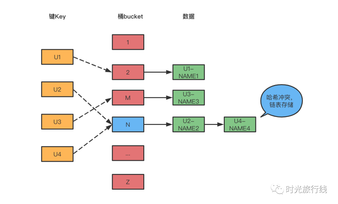 如上图,用户U2和U4根据哈希算法计算出来的值都是N,虽然形成哈希冲突,后续的值以链表的形式存储。