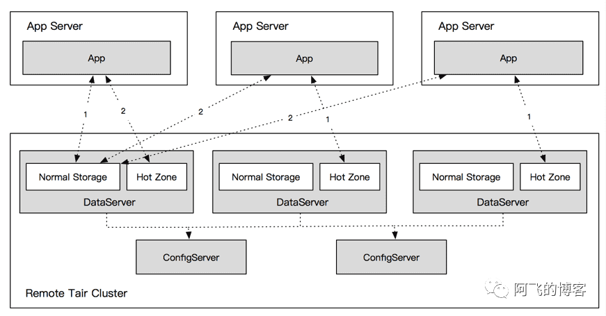 有一种办法就是自己处理本地缓存,这样代价比较大。阿里Tair的做法是热点散列,如下图所示,在每一个DataServer上开辟一个HotZone,统计到的热点KEY就保存到集群每一个节点上的HotZone中,客户端把热点数据KEY的请求随机打到任意一台DataServer的HotZone区域(热点KEY并不是Hash取模,这一点很重要),这样的话热点KEY请求就会被散列到多个节点乃至整个集群。那么整个Tair集群就不会因为某个热点KEY而发生过载的情况。本文不作过多的发散,有兴趣的同学请戳链接了解更多,非常值得一看:2017双11技术揭秘—分布式缓存服务Tair的热点数据散列机制:https://yq.aliyun.com/articles/316466。