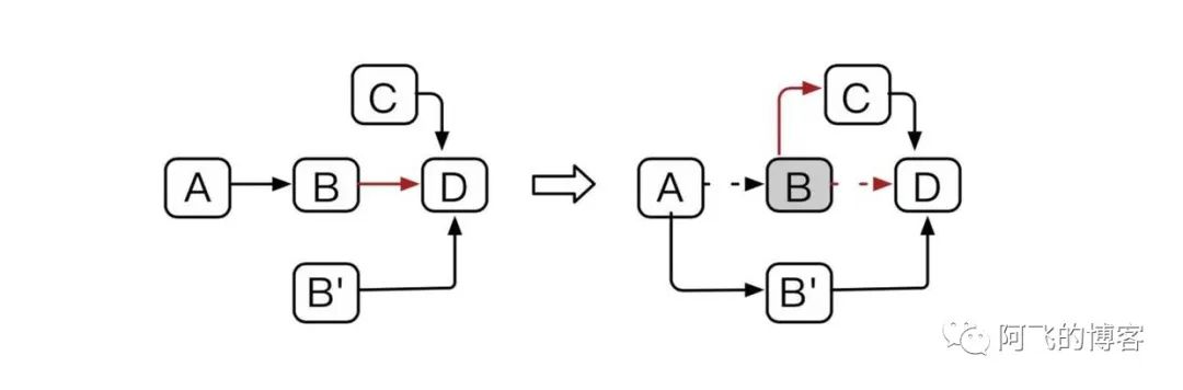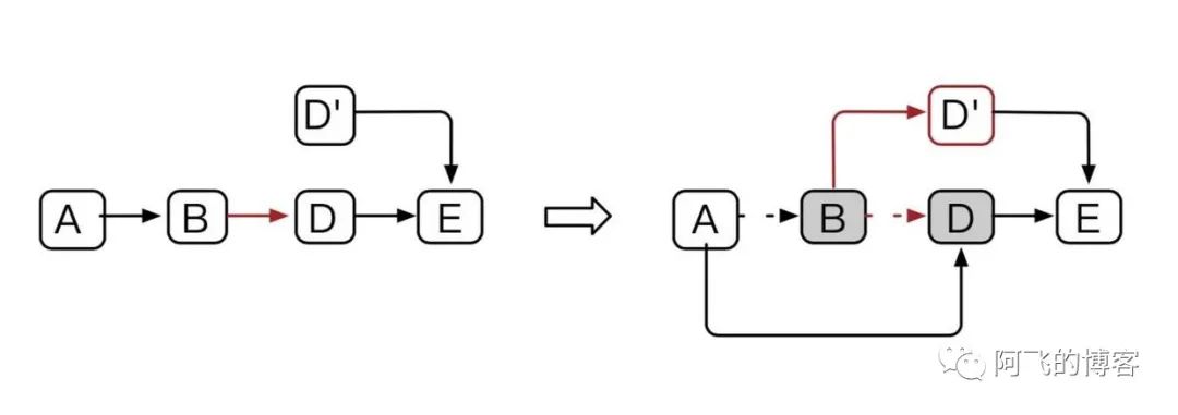 修改操作如下图所示,假设有一个线程将B修改为B‘,同时另一个线程将D修改为D‘,如果没有并发保护,就会导致最终的链路变成:A->B'->D->E,即D'会丢失: