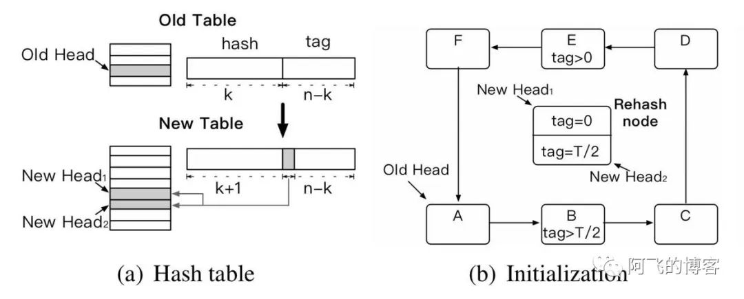 首先HotRing创建一个rehash的后台线程,这个线程初始化一个size是旧hash表两倍的新hash表。通过复用tag的最高一位来进行索引。因此,新表中将会有两个Head指针与旧表中的一个Head指针对应。HotRing根据tag范围对数据进行划分。假设tag最大值为T,tag范围为[0,T),则两个新的Head指针对应tag范围为[0,T/2)和[T/2,T)。同时,rehash线程创建一个rehash节点(如下右图中间节点所示,包含两个空数据的子元素节点),子元素节点分别对应两个新Head指针(Head1和Head2)。HotRing利用元素中的Rehash标志位识别rehash节点的子元素节点:
