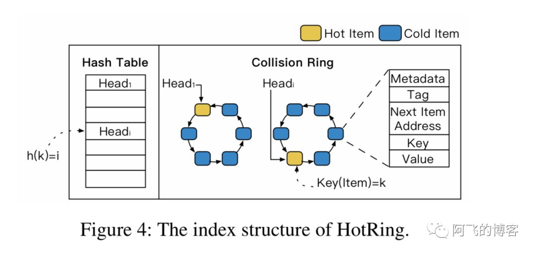 如上面的(Figure 4)图描述了HotRing的索引结构,它主要改进了传统Hash索引冲突链表结构。阿里HotRing的设计将最后一个KEY和第一个KEY连起来,并称之为冲突环。这样的话,Head指针可以指向任意一个元素,并不一定是固定在链表的第一个元素。这样的设计,就可以将Head指向热点数据。需要注意的是,当冲突环上只有一个数据时,Head的next指向它本身。