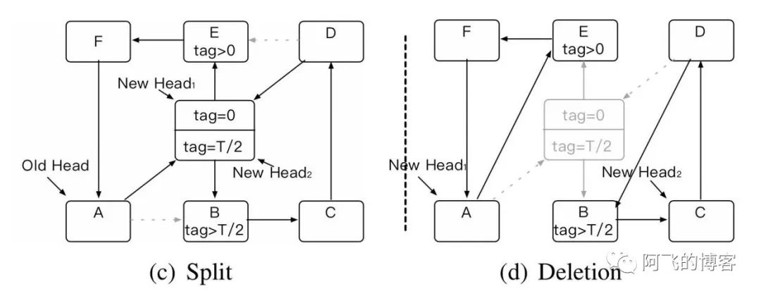 在分裂阶段,rehash线程通过将rehash节点的两个子元素节点插入冲突环中完成环的分裂。如图(Split)所示,因为B和E是tag的范围边界,所以子元素节点分别插入到B和E之前。完成两个插入操作后,新hash表将激活,所有的访问都将通过新hash表进行访问。到目前为止,已经在逻辑上将冲突环一分为二。接下来当我们查找数据时,最多需要扫描相比旧hash表一半的元素: